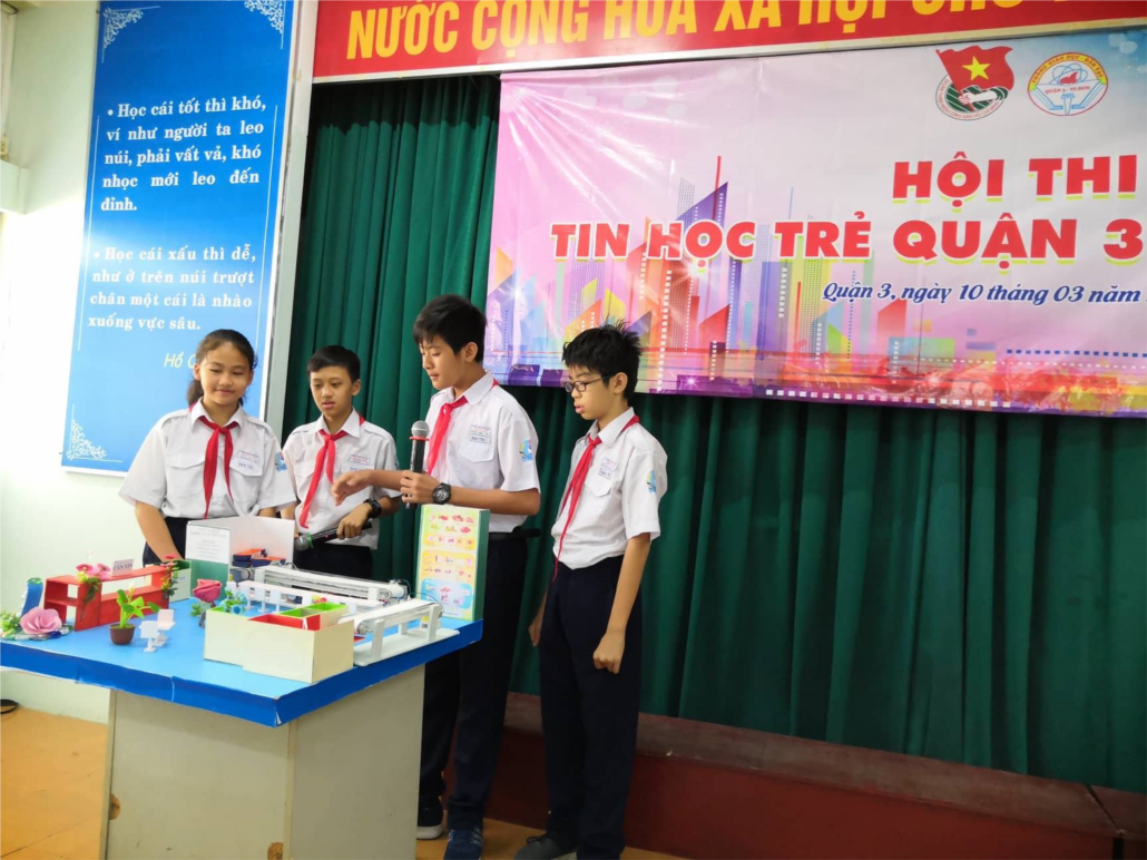 Không ngừng học hỏi và thỏa sức với đam mê sáng tạo của mình, các em học sinh trong Câu lạc bộ sáng tạo của trường THCS Bàn Cờ tiếp tục tham gia cuộc thi "Tin học trẻ Quân 3" - năm 2019 với phần thi thiết kế mô hình. Đó là các em: