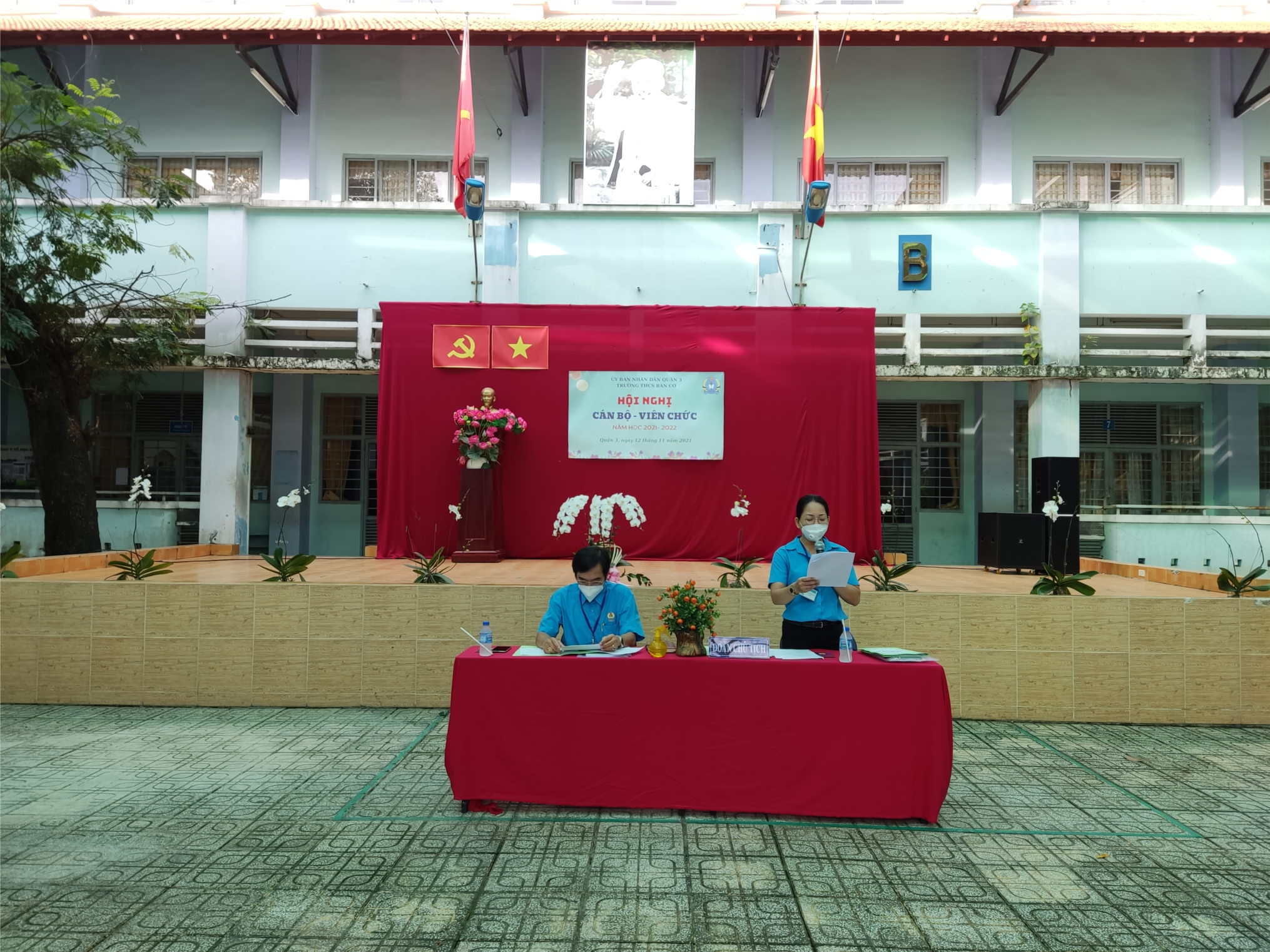 Thực hiện theo hướng dẫn số 08 ngày 01/11/2021/HD-LĐLĐ Liên đoàn Lao động Quận 3 về hướng dẫn tổ chức Hội nghị cán bộ công chức, viên chức năm 2022, Chính quyền phối hợp cùng Công đoàn trường THCS Bàn Cờ tổ chức Hội nghị Cán bộ - Viên chức năm học 2021 - 2022 tại sân trường nhằm đảm bảo công tác phòng chống dịch Covid-19.