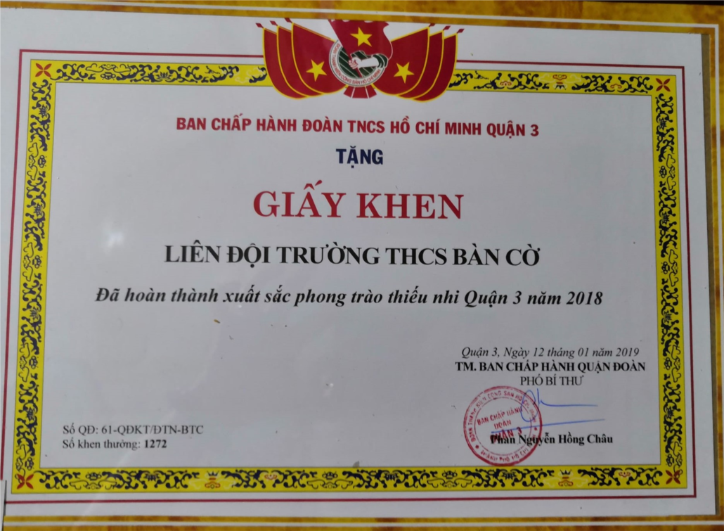 Ngày 12/1/2019, Liên Đội Bàn Cờ tham dự Lễ tổng kết hoạt động của Nhà Thiếu nhi quận 3 năm 2018 và đã nhận được giấy khen hoàn thành xuất sắc phong trào thiếu nhi Quận 3 năm 2018 do Ban Chấp hành Đoàn TNCS Hồ Chí Minh Quận 3 tặng.