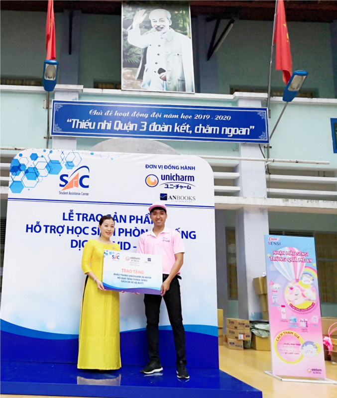 | Sáng ngày 01/06/2020, Trung tâm Hỗ trợ học sinh, sinh viên Thành phố phối hợp với Công ty cổ phần Diana Unicharm tổ chức trao tặng cho Liên đội THCS Bàn Cờ 720 cái khẩu trang Unicharm 3D Mask Super Fit cùng các sản phẩm hỗ trợ khác gồm 150 vé xe buýt miễn phí, 50 Sách “Đại dịch tim không thình thịch – Corona từ A đến Z, Bộ quà tặng Diana Sensi dành cho nữ sinh và nữ cán bộ, giáo viên của trường. Cô Nguyễn Thị Thanh Tuyền - Phó Hiệu trưởng đại diện nhà trường nhận các sản phẩm từ phía đơn vị tài trợ. |