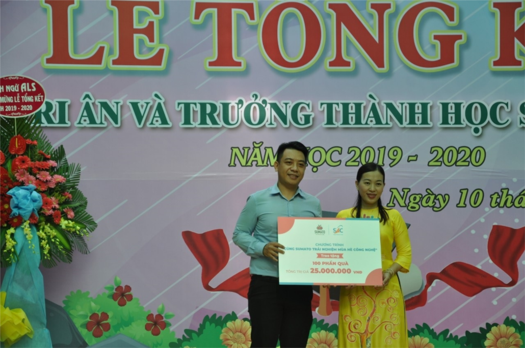 | Trong buổi Lễ Tổng kết năm học 2019 - 2020, Trung tâm Hỗ trợ học sinh, sinh viên TP. HCM phối hợp với công ty Cổ phần Giáo dục SUMATO tổ chức chương trình "Đi SUMATO trải nghiệm mùa hè công nghệ" đã trao tặng bảng tượng trưng 100 phần quà trị giá 25.000.000 đồng và tặng vé trải nghiệm tượng trưng cho các em học sinh của trường THCS Bàn Cờ. |